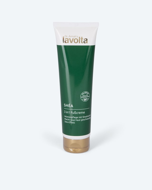 Die reichhaltige Dr. Armah Lavolta Shea Fußcreme mit Sheabutter bietet schnelle Hilfe für beanspruchte, raue Füße. Sheabutter und Olivenöl unterstützen die Lipidbarriere der Haut und bewahren sie damit vor dem Austrocknen.