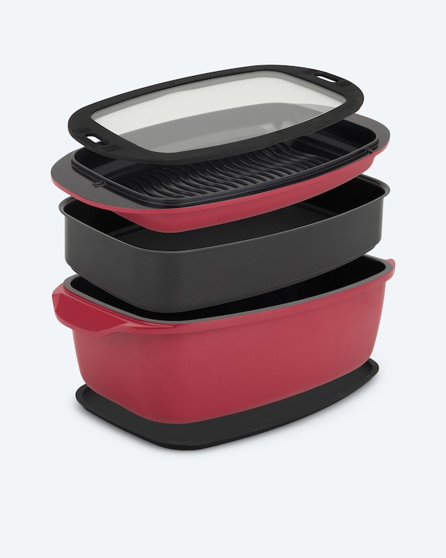 Der Dampfgarer ist beliebt bei Gemüse-Fans und sorgt für schonend gegarte Beilagen. Er ist mit einem Silikonuntersetzer ausgestattet und kann auch als Backform verwendet werden.