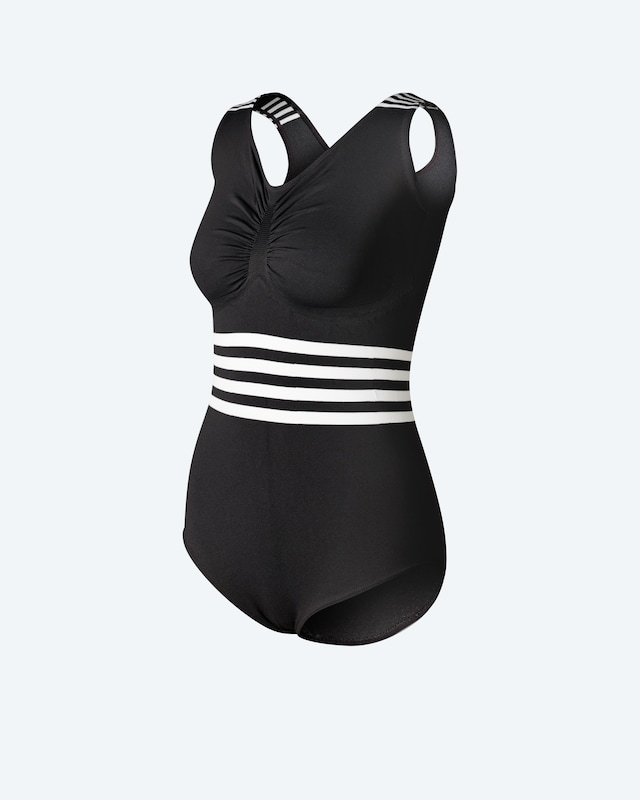 Ob für den Urlaub oder beim Schwimmen in Hallen- oder Freibad – mit diesem wunderschönen Badeanzug von Schlankstütz machen Sie immer eine gute Figur. Das Design punktet durch seine schlichte Eleganz: Ein Streifendekor an der Taille wirkt optisch verschlankend, feine Streifen am Träger setzen zusätzliche Akzente.