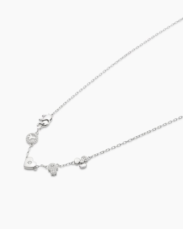 Dieses süße Collier besticht durch sein junges, verspieltes Design. In der Mitte sitzen fünf hübsche Deko-Elemente, etwa ein Peace-Symbol, ein Herz und ein Elefant. Jedes Element ist detailgenau gestaltet und teils mit Zirkonia besetzt. Insgesamt wurden 46 runde, weiß glitzernde Steinchen verarbeitet. Das Collier kann mit gelbvergoldetem oder palladiniertem Finish bestellt werden.