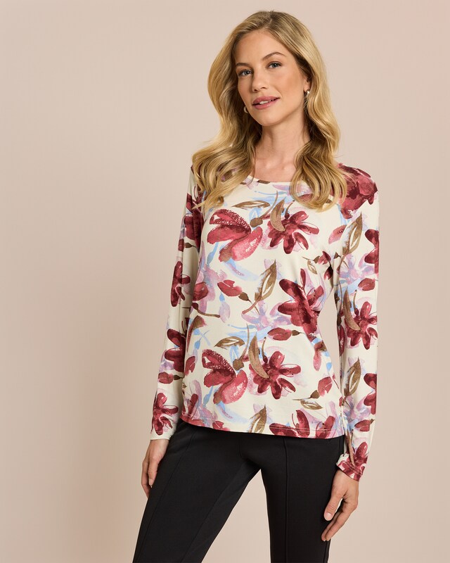 Lassen Sie sich von der Blütenpracht verzaubern! Dieses Langarmshirt mit Blumen-Druck ist ein wahrer Hingucker. Der weiche Jersey aus ECOVERO™-Viskose schmiegt sich angenehm an die Haut und sorgt für ein herrliches Tragegefühl. Die klassische Passform umspielt sanft Ihre Silhouette und eignet sich perfekt für den Alltag. Ob zur Jeans oder zum Rock - dieses Shirt ist Ihr treuer Begleiter für jede Gelegenheit. Ein Hauch von Frühling für Ihre Garderobe.