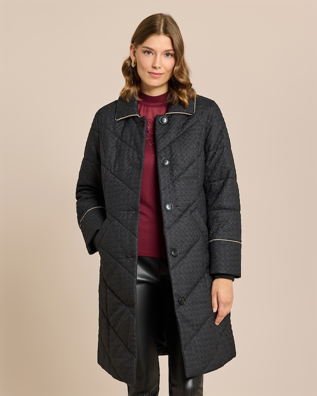 Dieser Steppmantel verzaubert mit raffiniertem Design und praktischer Funktionalität. Die strukturierte Oberfläche und die edlen Kettenapplikationen an Kragen und Ärmeln verleihen dem Mantel eine besondere Note. Mit praktischen Innentaschen und seitlichen Taschen bietet er Platz für alle Essentials. Der Hemkragen und die Knopfleiste sorgen für einen klassischen Look. Die Rückenlänge von 102 cm in Größe 38 garantiert optimalen Schutz. Dank des pflegeleichten Materials ist der Mantel der perfekte Begleiter für den Alltag - stilvoll und praktisch zugleich.