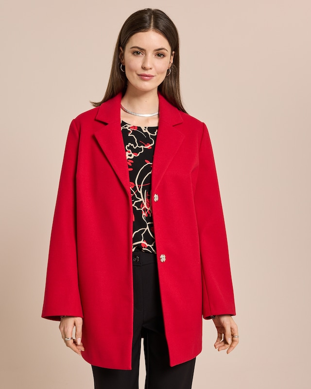Dieser Übergangsmantel verzaubert mit seiner Wolloptik und verleiht Ihrem Auftritt eine besondere Note. Der Reverskragen und die Druckknöpfe setzen stilvolle Akzente, während die langärmlige Silhouette eine angenehme Wärme spendet. Mit einer Rückenlänge von ca. 82 cm in Größe 38 umschmeichelt er gekonnt Ihre Figur. Das pflegeleichte Material lässt sich mühelos bei 30°C in der Maschine waschen. Von Büro bis Wochenendausflug - dieser Mantel ist Ihr treuer Begleiter durch alle Lebenslagen.