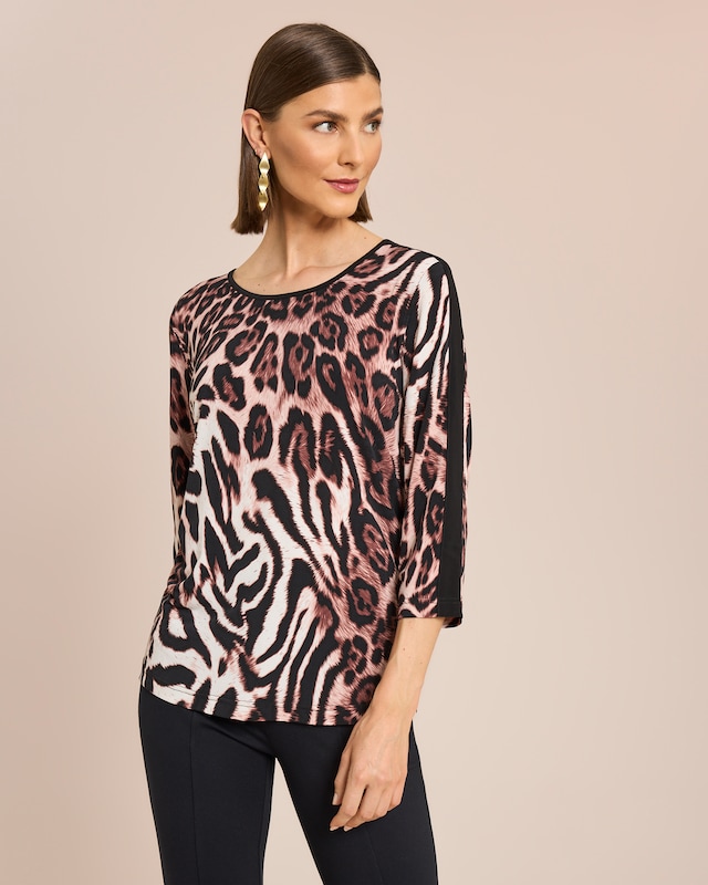 Lassen Sie Ihre Garderobe mit diesem faszinierenden Shirt im Animalprint aufblühen. Der ausdrucksstarke All-Over-Druck verleiht Ihrem Outfit eine selbstbewusste Note. Dank des figurschmeichelnden Schnitts mit 3/4-Ärmeln und rundem Halsausschnitt passt es sich perfekt Ihrer Silhouette an. Die leicht abgerundete Saumkante sorgt für eine feminine Linie. Gefertigt aus pflegeleichtem Material begleitet Sie dieses Shirt mühelos durch Ihren Alltag. Ein Hauch von Wildnis für Ihren Kleiderschrank - stilsicher und unkompliziert zugleich.