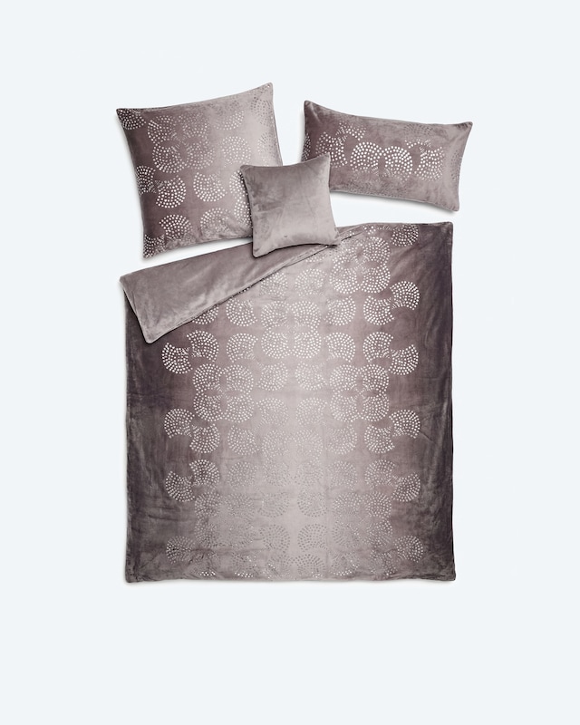 Mit dieser schicken Wendebettwäsche kommt frischer Wind in Ihr Schlafzimmer-Ambiente. Die vierteilige Wendebettwäsche ist auf der Vorderseite mit grafischen Glitterblüten bedruckt, die Rückseiten sind unifarben - so können Sie je nach Lust und Laune wählen. Das Set enthält drei Kissenbezüge in verschiedenen Größen, sowie einen Deckenbezug in der Größe Ihrer Wahl. So kreieren Sie im Handumdrehen eine kuschelige Schlafoase. Alle Bezüge sind mit Reißverschlüssen ausgestattet und bequem bei 40° waschbar. Das antistatische, weiche und warme Material ist für Ihr gutes Gefühl auf etwaige Schadstoffe überprüft und mit dem Öko-Tex Label zertifiziert.