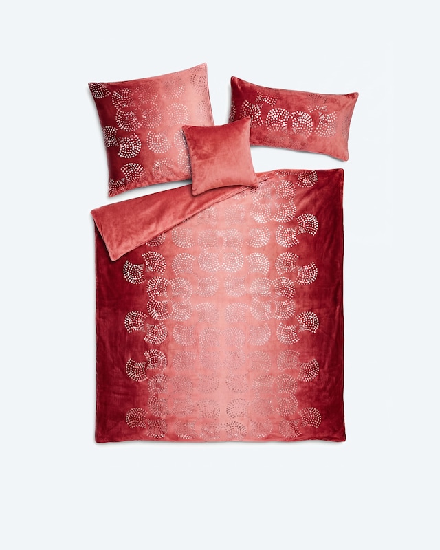 Mit dieser schicken Wendebettwäsche kommt frischer Wind in Ihr Schlafzimmer-Ambiente. Die vierteilige Wendebettwäsche ist auf der Vorderseite mit grafischen Glitterblüten bedruckt, die Rückseiten sind unifarben - so können Sie je nach Lust und Laune wählen. Das Set enthält drei Kissenbezüge in verschiedenen Größen, sowie einen Deckenbezug in der Größe Ihrer Wahl. So kreieren Sie im Handumdrehen eine kuschelige Schlafoase. Alle Bezüge sind mit Reißverschlüssen ausgestattet und bequem bei 40° waschbar. Das antistatische, weiche und warme Material ist für Ihr gutes Gefühl auf etwaige Schadstoffe überprüft und mit dem Öko-Tex Label zertifiziert.
