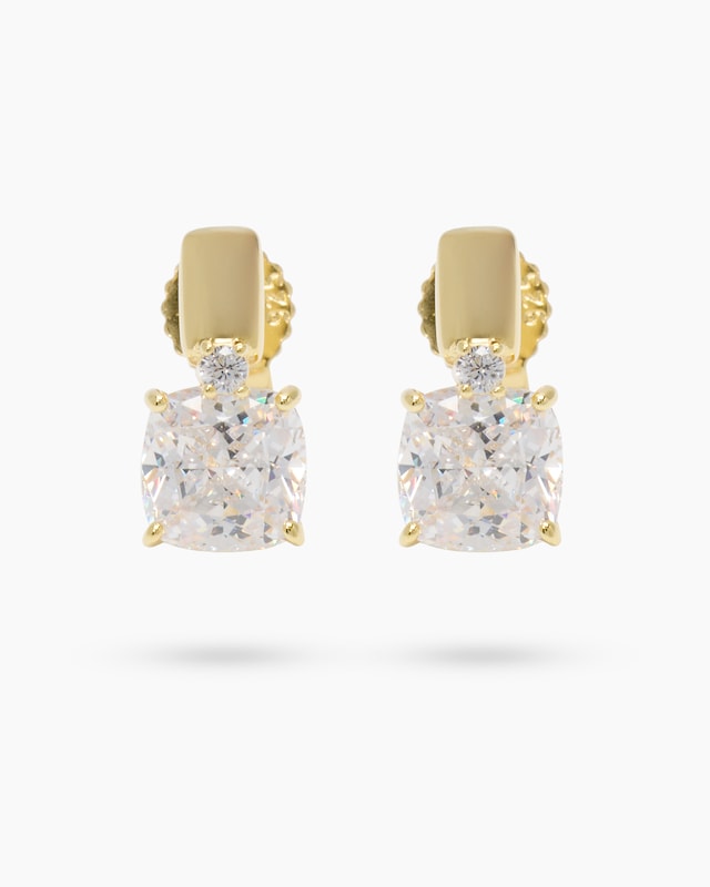 Ihr fantasievolles Design und der eindrucksvolle Besatz mit auffallenden weißen Zirkonia macht diese Ohrstecker zu glitzernden Blickmagneten an Ihrer Halspartie. Jeder Stecker ist mit einem großen, kissenförmigen Zirkonia sowie einem kleineren in runder Form ausgefasst. Das Quartett ist sorgfältig facettiert, so ergeben sich hinreißende Funkel-Reflexe bei jedem Lichteinfall. Bestellen Sie Ihre neuen Silber-Ohrstecker wahlweise in sonnenwarmer Gelbgold- oder kühl-eleganter Weißgoldoptik, also gelbvergoldet oder silberweiß rhodiniert.