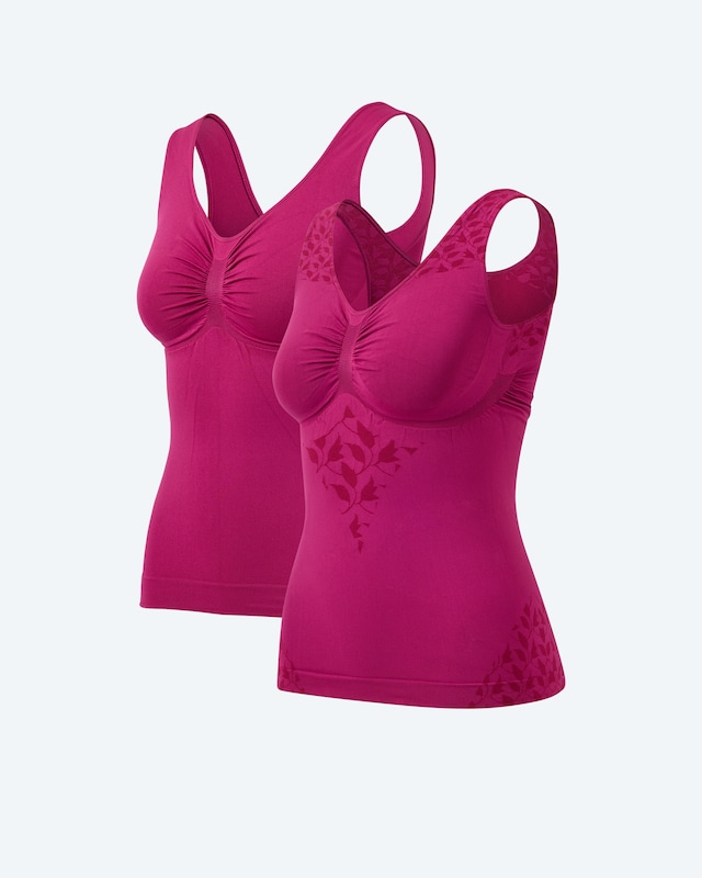 Umhüllen Sie sich mit purer Anmut. Diese Leichttops der Silhouette-Serie zaubern mühelos eine schmeichelnde Silhouette. Der Rundhalsausschnitt und die breiten Träger bieten angenehmen Halt, während das weiche Material mit leichtem Stützeffekt den Körper sanft modelliert. Ein Top besticht durch seine schlichte Eleganz, das andere verzaubert mit filigranen Blätterranken. Die pflegeleichte Strickware aus Polyamid und Elasthan passt sich perfekt Ihren Bewegungen an und unterstreicht Ihre natürliche Ausstrahlung – für ein selbstbewusstes Gefühl den ganzen Tag.