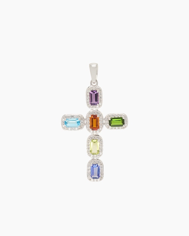 Entdecken Sie die strahlende Vielfalt dieses Anhängers: Ein Kreuz aus rhodiniertem 925er Sterlingsilber, kunstvoll ausgefasst mit einem Madeira Citrin, einem Tansanit AA+, einem Chromdiopsid, einem SwissBlue Topas, einem Amethyst und einem Peridot. Umrahmt von 96 weißen Zirkonen, funkelt dieses Schmuckstück in allen Farben des Regenbogens. Alle Edelsteine zusammen, jeder einzelne facettiert und von Krappen sicher gehalten, erstrahlen mit ca. 2,74 ct. Ein leuchtendes Schmuck-Statement, das Ihren Stil perfekt unterstreicht.