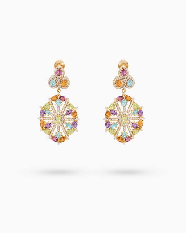 Veredeln Sie Ihren Look mit diesen meisterhaften Ohrsteckern: Gelbvergoldetes 925er Sterlingsilber formt ein aufwendiges Ornament, das mit einer Fülle an Edelsteinen besetzt ist. Jeder Ohrstecker erstrahlt mit 5 Peridots, 2 Rhodolithen, 5 Blauen Topasen, 5 Citrinen, 4 Amethysten, einem lila Granat und 30 weißen Zirkonen. Alle Steine sind facettiert, in Krappen gefasst und bringen zusammen ca. 6,02 ct zum Leuchten. Ein Fest für die Augen, das Ihre natürliche Schönheit unterstreicht.