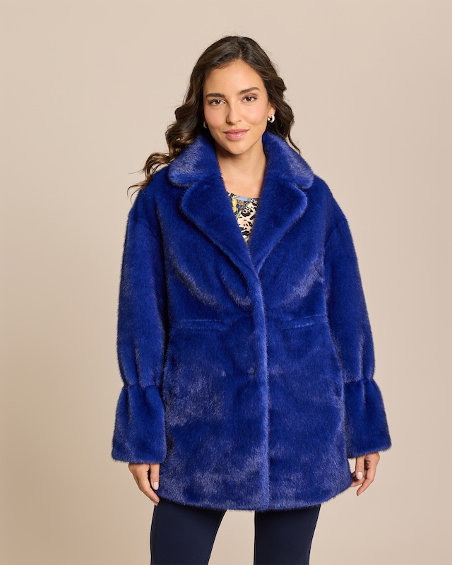 Hüllen Sie sich in pure Eleganz. Diese Webpelzjacke mit Reverkragen verzaubert durch ihre samtige Textur und den klassischen Schnitt. Der verdeckte Verschluss sorgt für eine cleane Optik, während die mittellange Passform Ihre Figur perfekt in Szene setzt. Mit einer Rückenlänge von ca. 81 cm in Größe 38 schmeichelt sie jeder Silhouette. Das pflegeleichte Material aus 100% Polyester macht sie zum idealen Begleiter für den Alltag. Ein Hauch von Luxus, der Ihren Stil auf ein neues Level hebt.