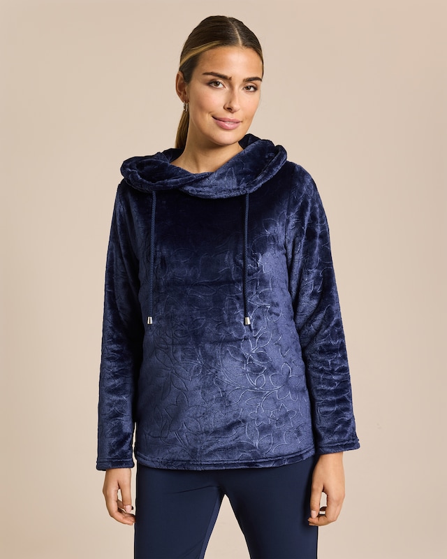 Verwöhnen Sie sich mit einem Hauch von Luxus im Alltag. Der Pullover aus Soft-Fleece umschmeichelt Ihre Silhouette mit einem geprägten Blumenmuster, das Eleganz und Komfort vereint. Der großzügige Kuschelkragen mit praktischer Kordel bietet zusätzlichen Schutz an kühlen Tagen. Mit langen Ärmeln und einer Rückenlänge von ca. 68 cm in Größe 38 passt er perfekt zu Ihrer Garderobe. Das pflegeleichte Material macht ihn zum idealen Begleiter für entspannte Momente zu Hause oder unterwegs. In den Größen 36 bis 54 erhältlich, findet jede Dame ihr passendes Stück. Dieser Pullover ist mehr als nur ein Kleidungsstück – er ist Ihre persönliche Wohlfühloase.