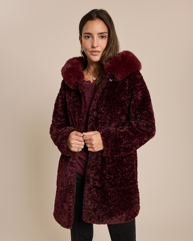 Umhüllen Sie sich mit luxuriösem Komfort. Der Wendemantel "Teddy" verwöhnt Sie mit flauschigem Webpelz und einer glatten Seite für vielseitige Styling-Optionen. Die großzügige Kapuze und geräumigen Taschen bieten zusätzlichen Schutz vor kühler Witterung. Mit einer Länge von ca. 84 cm schmeichelt er jeder Figur und lässt sich mühelos zu verschiedenen Outfits kombinieren. Dieser Mantel ist Ihr treuer Begleiter für entspannte Spaziergänge und gemütliche Abende.