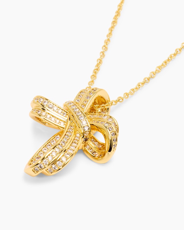 Tragen Sie Ihr Glaubenssymbol mit Eleganz und Brillanz. Unser Kreuzanhänger und die passende Kette, wahlweise gelbvergoldet oder palladiniert, sind ein eindrucksvoller Blickfang. Das verschlungene Kreuz ist kunstvoll mit 123 funkelnden Zirkonia veredelt. Die Glitzersteine sind im Brillantschliff veredelt und im Pavé gefasst. Der Anhänger ist abnehmbar, damit Sie die Kette auch solo tragen oder anders kombinieren können.