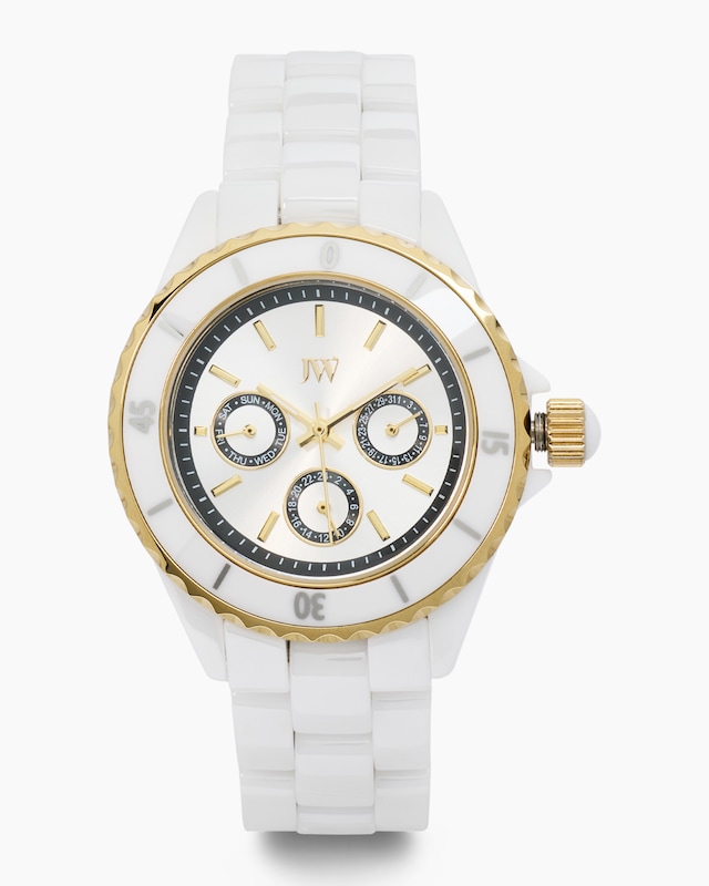 Diese Damenuhr aus der Judith Williams Kollektion wirkt sportlich und elegant zugleich. Die aparte Verarbeitung mit Keramik sorgt für eine betont feminine Aura, erhältlich in wahlweise weißer oder schwarzer Ausführung. Das runde Gehäuse zeigt Zahlen bei Minute 0, 15, 30 und 45, wobei die restlichen Stunden durch Indexstriche auf dem Zifferblatt markiert sind. Die drei kleinen Anzeigen informieren jeweils über die Stunde, Kalenderwoche sowie den Wochentag. Die hochwertige Uhr hat ein Quarzwerk und ist gegen Spritzwasser geschützt (3 ATM).