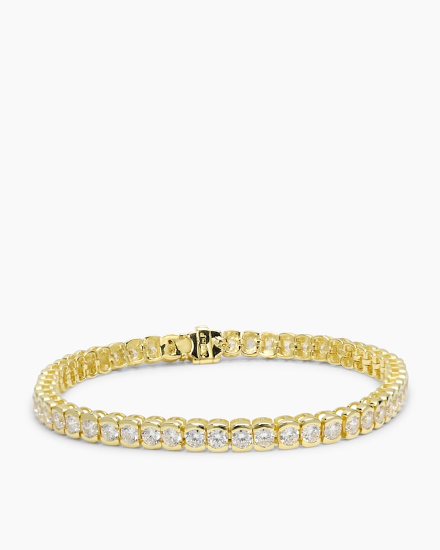 Lassen Sie sich verzaubern von unserem exquisiten Tennisarmband aus 925er Sterlingsilber, wahlweise gelbgoldplattiert oder rhodiniert. Hochglanzpoliert und besetzt mit 118 funkelnden, weiß facettierten Zirkonia-Steinen im Brillantschliff, eingefasst in edler Zargenfassung, garantiert es glamouröse Auftritte. Erhältlich in 17,5 oder 20 cm Länge, bietet das Armband mit sicherem Kastenschloss perfekten Tragekomfort. Setzen Sie ein Statement bei jedem Anlass.