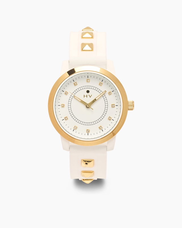 Mit der stilvollen Uhr von Helena Vera tragen Sie nicht nur einen Zeitmesser, sondern auch ein Accessoire, das Ihrem Look das gewisse Etwas verleiht. Sie ist mit einem Metall-Gehäuse mit Zifferblatt und Strickindexen ausgestattet. Unter der 12 befindet sich das Helena Vera Logo, die Zeiger sind fluoreszierend. Glitzernder Blickfang sind die 12 runden Kristalle, die für einen edlen Touch sorgen. Dazu passt das robuste und bequem sitzende Silikonarmband mit Dornschließe. Die IP-Beschichtung macht das Gehäuse widerstandsfähig und gibt ihm einen hochwertigen, edlen Look.