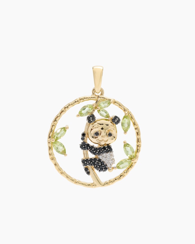 Für Ihre Halsketten hat sich Harry Ivens mit diesem Anhänger etwas ganz Besonderes ausgedacht. Das runde Schmuck-Accessoire zeigt Blätter und einen niedlichen Pandabären, dessen Körper aus Edelsteinen besteht: grüner Peridot (Blätter), schwarzer Spinell (Arme und Beine) und weißer Zirkon (Rücken). Die facettierten Edelsteine überziehen Ihr Dekolleté mit einem Hauch von Glamour und das Tiermotiv gibt dem Anhänger eine verspielte,kreative Note. Das Schmuck-Accessoire aus vergoldetem Sterlingsilber ist ideal für Ihre Goldketten.