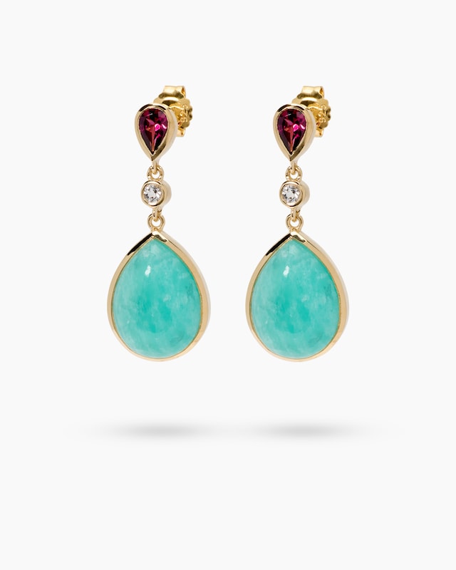 Für diesen aparten Ohrschmuck hat unser Experte Harry Ivens drei verschiedene Edelsteine stilvoll kombiniert. Blauer Amazonit in Tropfenform, roter Rhodolith in Tropfenform und runder Weißtopas verschmelzen zu einer eindrucksvollen Schmuckkreation. Die Edelsteine sind im Cabochonschliff veredelt und facettiert. Sie werden in klassischen Zargenfassungen gehalten und bringen zusammen ca. 19,72 Carat auf die Waage. Eingebettet sind die karatstarken Farbedelsteine in gelbvergoldetes 925er Sterlingsilber mit Hochglanzfinish. Gönnen Sie sich dieses Must-have für Edelstein-Liebhaberinnen.