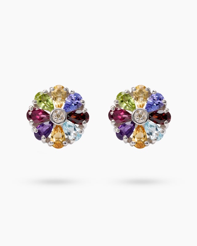 Lassen Sie sich von unseren farbschönen Multi-Edelstein-Ohrsteckern verzaubern. Aus rhodiniertem 925er Sterlingsilber gefertigt und hochglanzpoliert, präsentieren sie ein elegantes, rundes Design in Form einer stilisierten Blüte. Die funkelnden Blütenblätter werden von ausgesuchten EDelsteinen dargestellt: je ein Amethyst, AA Tansanit, SkyBlue Topas, Peridot, Citrin, Granat und Rhodolith reihen sich harmonisch aneinander. Alle Steine sind facettiert und sitzen in Krappen. Im Zentrum thront ein weißer P2-Diamant in Zargenfassung. Perfekt für festliche Momente oder um Ihren Alltag zu verschönern.