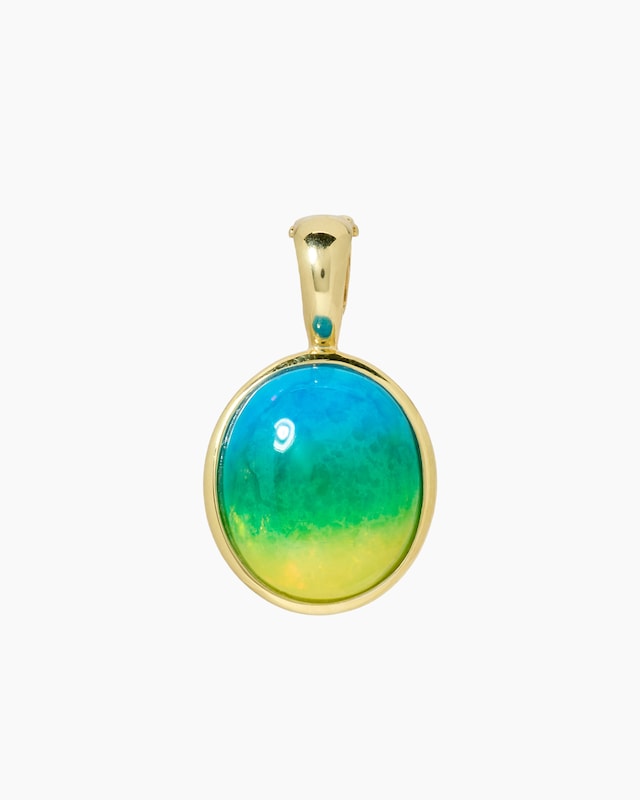 Solitärschmuck zum Verlieben sichern Sie sich mit diesem hinreißend schönen Anhänger. Das Highlight ist der Kristallopal in ovaler Form, der allein schon durch seine eindrucksvolle Größe begeistert. Klassisch im Cabochon veredelt, so kommt die individuelle Maserung des Steines optimal zur Geltung. Die feine Silberlegierung in sonnenwarmer Vergoldung umschmeichelt und verstärkt noch das Strahlen des Opals.