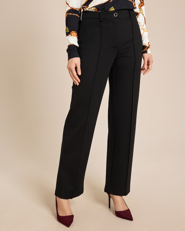Mühelos von Tag zu Abend - die Classic Hose von Alfredo Pauly verzaubert mit zeitloser Raffinesse. Der hochwertige Ponte-di-Roma-Stoff umschmeichelt Ihre Figur und sorgt für einen makellosen Sitz. Die geschmackvolle Biese am Vorderteil und der leicht konische Beinverlauf verleihen der Hose eine feminine Note. Praktische Gürtelschlaufen runden das Design ab. Mit einer Innenbeinlänge von ca. 77 cm in Größe 38 passt sie sich perfekt Ihrer Körpergröße an. Ob im Büro oder beim Dinner - diese Hose ist Ihr verlässlicher Begleiter für jeden Anlass.