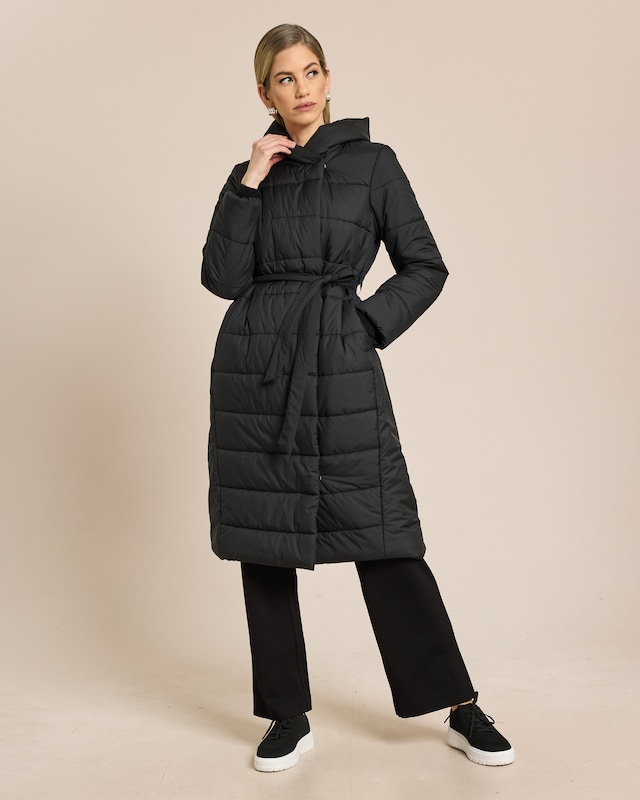 • Langer Steppmantel mit Kapuze