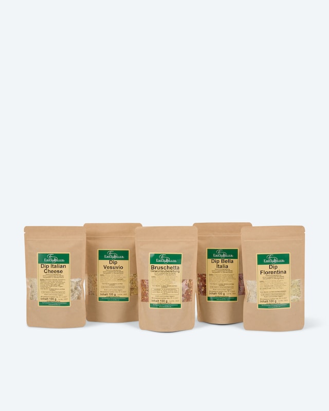 Tauchen Sie ein in die Welt Italiens mit unserem Dip Italien pur 5er-Set: Bella Italia begeistert mit fruchtig-würzigem Aroma, Italian Cheese glänzt knoblauchfrei mit Zwiebel, Pfeffer und Kräutern – ideal mit Parmesan. Florentina, mild und kräuterig, ist ein Kinderliebling, perfekt mit Mascarpone. Vesuvio bringt frische Zitrone und Amalfi-Kräuter mit Tomaten- und Paprikastückchen. Die Bruschetta-Gewürzzubereitung rundet das Set ab. Einfach in Joghurt, Quark oder Crème Fraîche einrühren und Urlaubsstimmung genießen.