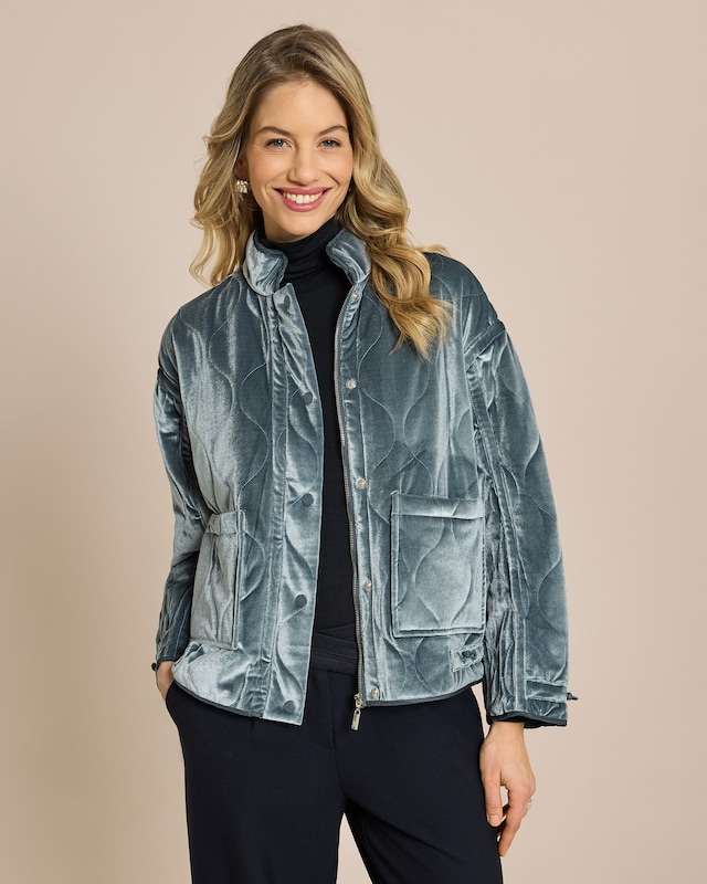Lassen Sie sich von der Samtjacke verzaubern – ein Stück, das Ihren Kleiderschrank bereichert. Der weiche Stoff schmiegt sich angenehm an und verleiht Ihnen eine edle Ausstrahlung. Mit dem Reißverschluss und den Druckknöpfen passen Sie die Jacke mühelos Ihrem Outfit an. Die Eingriffstaschen bieten Platz für kleine Essentials. Der Tunnelzug am geraden Saum ermöglicht eine individuelle Silhouette. Diese Jacke ist Ihr treuer Begleiter für viele Gelegenheiten.