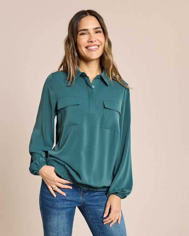 Mühelos von Tag zu Abend - diese Schlupfbluse verzaubert mit ihrer Vielseitigkeit. Der elastische Smock-Gummibund schmeichelt jeder Figur und sorgt für optimalen Tragekomfort. Praktische Brusttaschen bieten Platz für Kleinigkeiten, während die halbe Knopfleiste einen femininen Touch verleiht. Die langen Ärmel und der klassische Hemdkragen runden das Design stilvoll ab. In verschiedenen Farben erhältlich, passt sich diese Bluse mühelos Ihrem individuellen Stil an. Ein Must-have für jede Garderobe, das Komfort und Eleganz perfekt vereint.