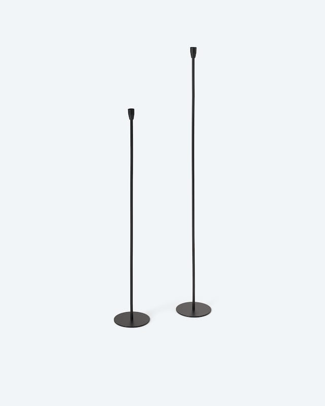 Mit ihrem zeitlos eleganten Metall-Design sind diese beiden Kerzenhalter das ganze Jahr über ein toller Blickfang. Die zwei Kerzenständer sind 80 und 100 Zentimeter hoch, sodass sie auch gut auf den Boden oder niedrige Möbel gestellt werden können. Praktisch: Dazu sind die Sockel an der Unterseite bereits mit Schonern versehen. Ihre neuen Halter sind für die LED-Stabkerzen von Flambiance optimiert, können aber natürlich auch anderweitig kombiniert werden.
