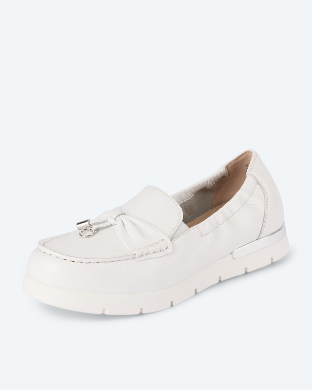Verwöhnen Sie Ihre Füße mit purer Eleganz. Dieser Mokassin aus feinstem Hirschleder schmiegt sich wie eine zweite Haut an Ihren Fuß. Die handgenähte Verarbeitung und der elastische Einfass garantieren perfekten Halt. Das Highlight: ein zarter Lederknoten mit funkelndem Strass-Anhänger. Die innovative On Air Sohle und die auswechselbare Innensohle sorgen für ein schwereloses Gehgefühl. In Weite G bietet er ausreichend Platz für einen angenehmen Sitz. Ob zum Shoppen oder für einen Stadtbummel - dieser Mokassin ist Ihr treuer Begleiter für stilvollen Alltagskomfort.