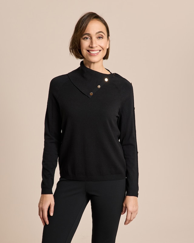 Dieser Strickpullover verzaubert mit seinem unverwechselbaren Charme. Der asymmetrische Kragen und die dekorativen Knopfdetails an Kragen und Ärmeln verleihen ihm eine besondere Note. Mit seiner angenehmen Materialmischung schmiegt er sich sanft an Ihre Haut und begleitet Sie stilvoll durch den Tag. Die lange Ärmelform und der eng anliegende Schnitt betonen gekonnt Ihre Silhouette. Ein vielseitiges Lieblingsstück, das sich mühelos von lässig bis elegant stylen lässt.