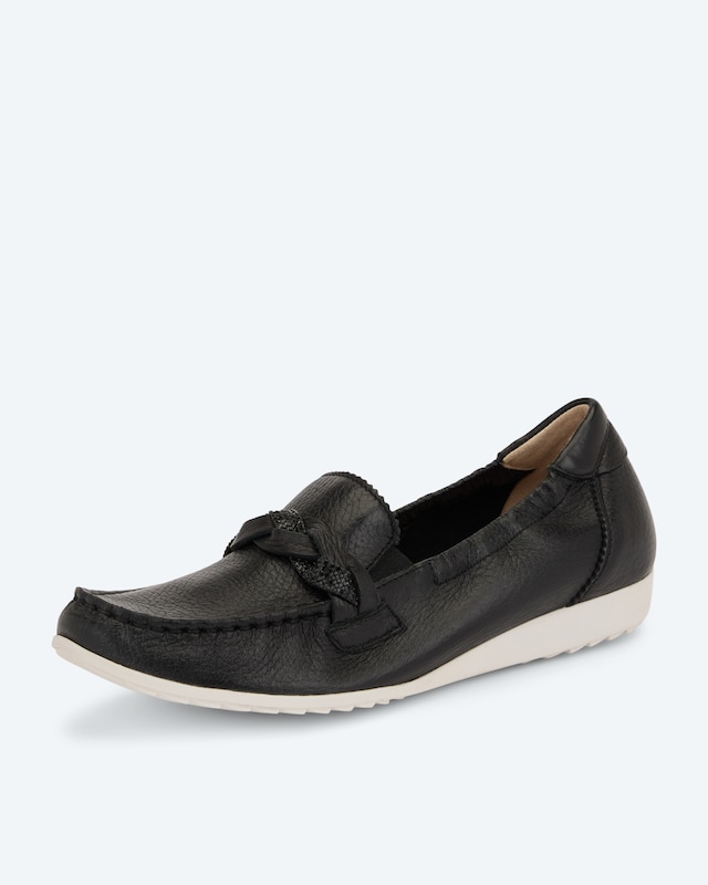 Lassen Sie sich von der Leichtigkeit des Seins verzaubern. Dieser Caprice Mokassin vereint meisterhaftes Handwerk mit modernem Flair. Das edle Hirschnappaleder schmiegt sich sanft an Ihren Fuß, während die elastische Einfassung für perfekten Halt sorgt. Die gepolsterte Ferse und die innovative On Air Sohle verwöhnen Sie bei jedem Schritt. Ein Hauch von Glamour verleiht die raffinierte Lederflechtung mit funkelndem Strassriemen. In der komfortablen Weite G gleiten Sie mühelos durch den Tag – stilvoll, bequem und mit einem Gefühl von Luxus an Ihren Füßen.