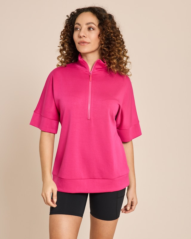 Lassen Sie sich von der Leichtigkeit des Seins umarmen. Der Relaxflex Troyer verwöhnt Sie mit seinem geschmeidigen Scuba-Stoff und dem bequemen Schnitt. Die Fledermausärmel schenken Ihnen grenzenlose Bewegungsfreiheit, während der Troyer-Kragen mit Reißverschluss für einen modernen Touch sorgt. Mit einer Rückenlänge von ca. 68 cm in Größe 38 schmeichelt er jeder Figur. Das dezente BK-Gummi-Logo auf der Brust setzt einen stilvollen Akzent. Ob beim Einkaufsbummel oder beim Kaffeeklatsch mit Freundinnen - dieser Troyer ist Ihr treuer Begleiter für entspannte Momente. Genießen Sie die Symbiose aus Komfort und Stil.
