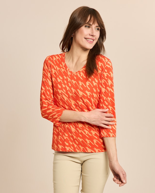 Dieses Shirt verzaubert mit seinem modernen Hahnentritt-Muster und verleiht Ihrem Outfit eine besondere Note. Der V-Ausschnitt und der leicht taillierte Schnitt betonen gekonnt Ihre feminine Silhouette. Die 3/4-Ärmel bieten angenehme Bewegungsfreiheit und machen das Shirt zum idealen Begleiter für verschiedenste Anlässe. Dank des pflegeleichten Materials aus Viskose und Elasthan genießen Sie höchsten Tragekomfort bei minimalem Pflegeaufwand. Ein vielseitiges Basicstück, das sich mühelos mit Ihrer bestehenden Garderobe kombinieren lässt.