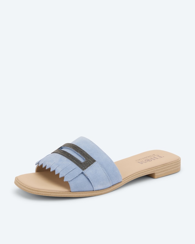 Lassen Sie Ihre Füße in diesen exquisiten Pantoletten aufblühen. Das hochwertige Veloursleder umschmeichelt Ihre Haut, während die verspielten Fransen und Metallperlen für einen Hauch von Glamour sorgen. Die Weichschauminnensohle verwöhnt Ihre Füße mit jedem Schritt. Dank des schlichten Designs ohne Verschluss gleiten Sie mühelos hinein und genießen sofort den Komfort der Weite G. Mit ihrem flachen Absatz von 2 cm sind diese Pantoletten der ideale Begleiter für lange Sommertage und laue Abende. Ein Accessoire, das Ihren Stil mühelos aufwertet und Ihre natürliche Ausstrahlung unterstreicht.