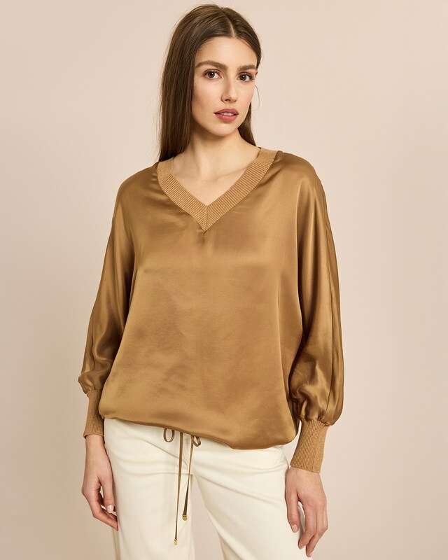 Lassen Sie sich von der Leichtigkeit des Seins umarmen. Diese Satin-Bluse aus Webware verzaubert mit ihrem seidigen Glanz und fließenden Fall. Der V-Ausschnitt mit Rippstrick-Einfassung setzt feminine Akzente, während die voluminösen Ärmel mit elastischen Bündchen für eine moderne Silhouette sorgen. Ob im Büro oder beim Dinner – diese Bluse verleiht Ihnen stets einen Hauch von Luxus und Selbstbewusstsein. Ein Allrounder, der sich mühelos von Tag zu Abend stylen lässt und Ihnen in jeder Situation ein Gefühl von Eleganz schenkt.