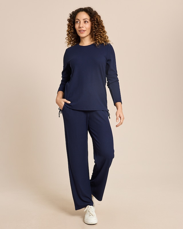 Umhüllen Sie sich mit Behaglichkeit. Dieser Freizeitanzug in Waffle-Optik verwöhnt Sie mit seiner angenehm weichen Struktur. Das Oberteil mit Rundhalsausschnitt und langen Ärmeln schmiegt sich sanft an Ihren Körper. Die bequeme Hose mit elastischem Bund und Kordelzug passt sich perfekt Ihrer Figur an. Ein Ensemble, das Ihnen nach einem langen Tag die wohlverdiente Entspannung schenkt und Sie gleichzeitig stilvoll kleidet.