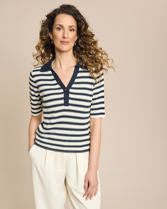Dieses gestrickte Poloshirt verleiht Ihrem Outfit eine Prise nautischen Flair. Der V-Ausschnitt mit dezenter Knopfleiste setzt feminine Akzente, während die halblangen Ärmel für angenehmen Tragekomfort sorgen. Das klassische Streifenmuster in Kombination mit der figurbetonten Passform schmeichelt Ihrer Silhouette und lässt sich mühelos vom Büro bis zum Abendessen stylen. Ein Hauch von Kaschmir in der Materialzusammensetzung sorgt für ein luxuriöses Tragegefühl. Dieses Poloshirt ist Ihr neuer Begleiter für einen stilvollen Alltag mit maritimem Touch.