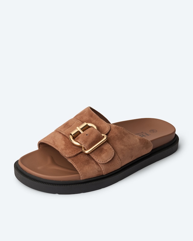 Dieser Sommerschuh verbindet mühelose Lässigkeit mit durchdachter Funktionalität. Die Pantolette aus hochwertigem Veloursleder überzeugt durch ihren breiten Riemen mit dekorativer Schnalle, die nicht nur ein stilvolles Accessoire darstellt, sondern auch eine individuelle Anpassung ermöglicht. Das weiche Fußbett schmiegt sich sanft an Ihre Füße und begleitet Sie durch lange Tage – ob beim Einkaufsbummel, Spaziergang oder entspannten Nachmittag im Garten. Die profilierte Laufsohle bietet zuverlässigen Halt auf verschiedenen Untergründen. Mit ihrer offenen Form lässt sich diese Pantolette mühelos zu Sommerkleidern, Röcken oder Ihrer Lieblingshose kombinieren. Die Bequemweite bietet ausreichend Raum für Ihre Zehen, sodass nichts drückt oder einengt. Ein Begleiter, der Ihren Alltag mit unkomplizierter Raffinesse bereichert.