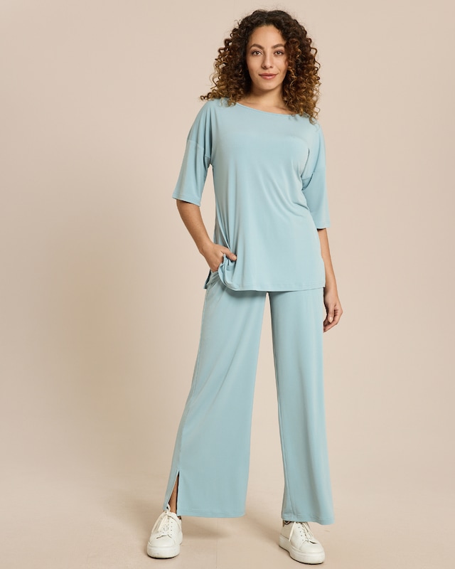 Entfalten Sie Ihre natürliche Ausstrahlung mit dem Shineflex Set. Das locker geschnittene T-Shirt mit kurzen Ärmeln und die Hose mit weitem Bein bilden ein harmonisches Duo. Der Gummibund und die praktischen Eingriffstaschen der Hose sorgen für Bequemlichkeit im Alltag. Der seitliche Schlitz verleiht dem Set eine modische Note. In Größen 36-48 erhältlich, passt sich das Set perfekt Ihrer Figur an. Die Innenbeinlänge von ca. 74 cm in Größe 38 garantiert eine flatternde Silhouette. Genießen Sie die Leichtigkeit des Materials und fühlen Sie sich den ganzen Tag wohl.