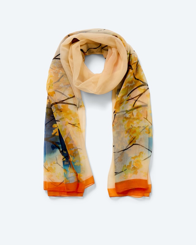 Wie ein Hauch von Frühling umschmeichelt dieser Schal Ihre Schultern. Das großzügige Format von 180x125 cm bietet vielfältige Stylingmöglichkeiten. Zarte Blütenzweige in warmen Gelb- und Orangetönen, akzentuiert durch kühle Blaunuancen, zaubern eine malerische Atmosphäre. Der leichte Webstoff aus Polyester gleitet angenehm über die Haut und lässt sich mühelos pflegen. Mit seiner einfarbigen Umrandung setzt der Schal mit Alloverdruck einen stilvollen Akzent zu Ihrer Garderobe. Ein Accessoire, das Ihre natürliche Ausstrahlung unterstreicht und Ihrem Outfit eine Prise Lebensfreude verleiht.