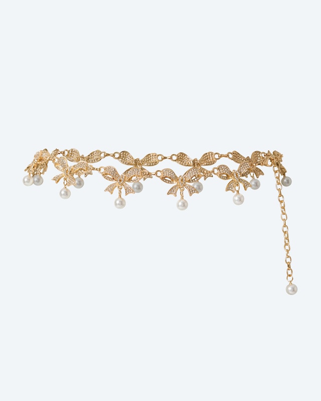 Dieser Kettengürtel verzaubert mit seiner filigranen Schönheit. Die zarten Schleifen, besetzt mit funkelndem Strass und edlen Perlen, verleihen jedem Outfit einen Hauch von Luxus. Dank des praktischen Karabinerverschlusses lässt sich die Länge individuell anpassen - für einen stets perfekten Sitz. Das hochwertige Design macht den Gürtel zu einem vielseitigen Begleiter, der sowohl Ihre Tagesgarderobe als auch festliche Ensembles gekonnt in Szene setzt. Ein Accessoire, das Eleganz und Funktionalität meisterhaft vereint.