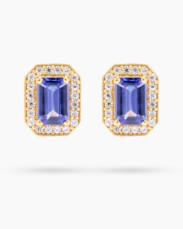 Lassen Sie sich von der faszinierenden Schönheit dieser exquisiten Ohrstecker verzaubern. Im Zentrum jedes Ohrsteckers thront ein kostbarer Tansanit in AAAA-Qualität, dessen blauvioletter Farbton das Licht auf magische Weise einfängt. Mit einem Gewicht von je ca. 0,55 ct und einem eleganten Achteckschliff sind diese Edelsteine wahre Blickfänger. Umrahmt werden die Tansanite von insgesamt 40 funkelnden weißen Zirkonen, die zusammen ca. 0,24 ct wiegen und dem Design zusätzlichen Glanz verleihen. Die Ohrstecker sind aus hochwertigem Sterlingsilber 925 gefertigt und mit einer edlen Gelbgold-Vergoldung veredelt, die dem Schmuckstück eine warme, luxuriöse Ausstrahlung verleiht. Mit einer Länge von ca. 0,9 cm und einer Breite von ca. 0,74 cm sind diese Ohrstecker perfekt proportioniert, um sowohl im Alltag als auch zu besonderen Anlässen zu begeistern. Der sichere Schmetterlingsverschluss sorgt für bequemen Tragekomfort. Diese Ohrstecker sind nicht nur ein Schmuckstück, sondern ein Statement von zeitloser Eleganz und raffiniertem Stil.