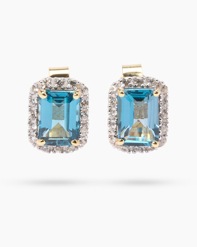 Diesen stilvollen Ohrschmuck aus fein vergoldetem Sterlingsilber 925 zieren insgesamt zwei Topase im dunkelblauen Farbton London Blue sowie 32 weiße Zirkone. Der Blautopas in seltener achteckiger Form ist im Smaragdschliff veredelt, während die Zirkone komplett facettiert wurden. Dadurch starten alle Edelsteine ein herrliches Funkel-Spektakel, sobald etwas Licht auf Ihre Halspartie fällt.