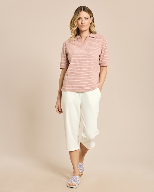 Ihre persönliche Wohlfühloase beginnt genau hier. Dieses zweiteilige Lounge-Set verbindet lässige Bequemlichkeit mit durchdachten Details, die Ihren Tag zu Hause verschönern. Das Oberteil präsentiert sich mit sportlichem Polokragen und V-Ausschnitt, während die halbarm geschnittenen Ärmel für angenehme Bewegungsfreiheit sorgen. Die dazu passende Capri-Hose sitzt dank elastischem Schlupfbund mühelos auf Nabelhöhe und begleitet Sie durch entspannte Nachmittage oder gemütliche Abende. Praktische Seitentaschen am Oberteil sowie an der Hose bieten Platz für kleine Dinge des Alltags. Die weiche Frottee-Qualität schmiegt sich sanft an und macht jede Bewegung mit. Ob beim Lesen auf der Terrasse oder beim Kaffeeklatsch mit der Nachbarin – dieses Set wird schnell zu Ihrem Lieblingsbegleiter. Gönnen Sie sich diese unkomplizierte Freude, die Ihren Alltag bereichert.
