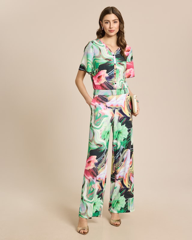 Dieser Overall verzaubert mit seinem exotischen Blumenmuster. Der gesmockte Bund schmeichelt der Figur, während die Flügelärmel für eine feminine Note sorgen. Dank des V-Ausschnitts mit Knopfleiste lässt sich das Dekolleté individuell in Szene setzen. Die weite Beinform und das leichte Material versprechen höchsten Tragekomfort an warmen Tagen. Ein Allrounder, der Sie vom Strand bis zum Abendessen stilvoll begleitet.