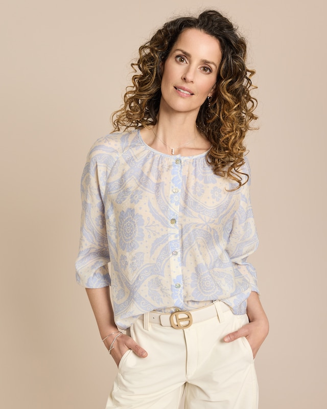 Ihre Garderobe bekommt einen Frischekick, der sich sehen lassen kann. Diese bedruckte Viskosebluse von THOM by Thomas Rath vereint mühelose Lässigkeit mit durchdachten Details. Der weite Schnitt schmeichelt jeder Figur, während die Fledermausärmel für angenehme Bewegungsfreiheit sorgen. Der Rundhalsausschnitt mit durchgehender Knopfleiste lässt sich vielseitig stylen – ob geschlossen oder locker geöffnet. Besonders raffiniert: die Perlmuttknöpfe mit eingravierten Logo-Details. Das elastische Bündchen an den Ärmeln setzt einen modernen Akzent und sorgt für optimalen Sitz. Kombinieren Sie diese Bluse zur Lieblingshose oder zum Rock – sie passt einfach immer. Pflegeleicht in der Maschine waschbar, begleitet sie Sie durch jeden Tag. Ein Oberteil, das Ihnen das Leben leichter macht.