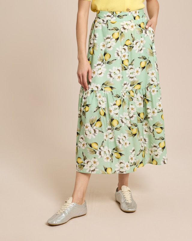 Dieser Rock verwandelt jeden Spaziergang in einen sommerlichen Auftritt voller Leichtigkeit. Der fließende Schnitt reicht bis knapp über die Knöchel und schmeichelt Ihrer Figur mit einem angenehm weiten Fall. Der elastische Bund sorgt für müheloses Anziehen und sitzt den ganzen Tag über bequem, ohne einzuschneiden. Besonders reizvoll ist die Raffung im unteren Bereich, die dem Saum eine verspielte Bewegung verleiht. Das lebhafte Früchte-Motiv mit Blüten bringt frische Stimmung in Ihre Garderobe und lässt sich wunderbar zu einfarbigen Oberteilen kombinieren. Die weiche Webware fühlt sich angenehm auf der Haut an und macht jede Bewegung mit. Ob zum Marktbesuch, Kaffeeklatsch oder Gartenparty – dieser Rock begleitet Sie stilvoll durch warme Tage. Ein Stück, das Ihnen immer wieder Freude bereitet.